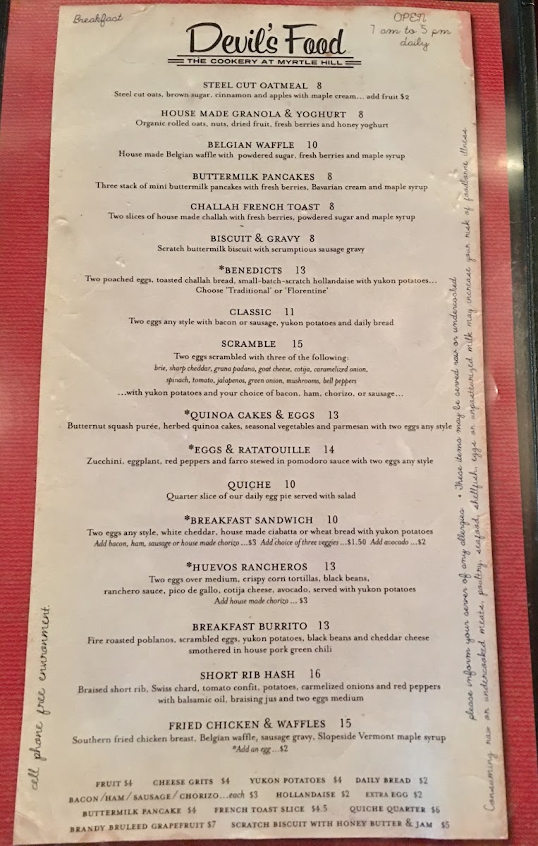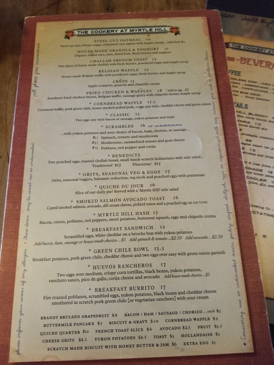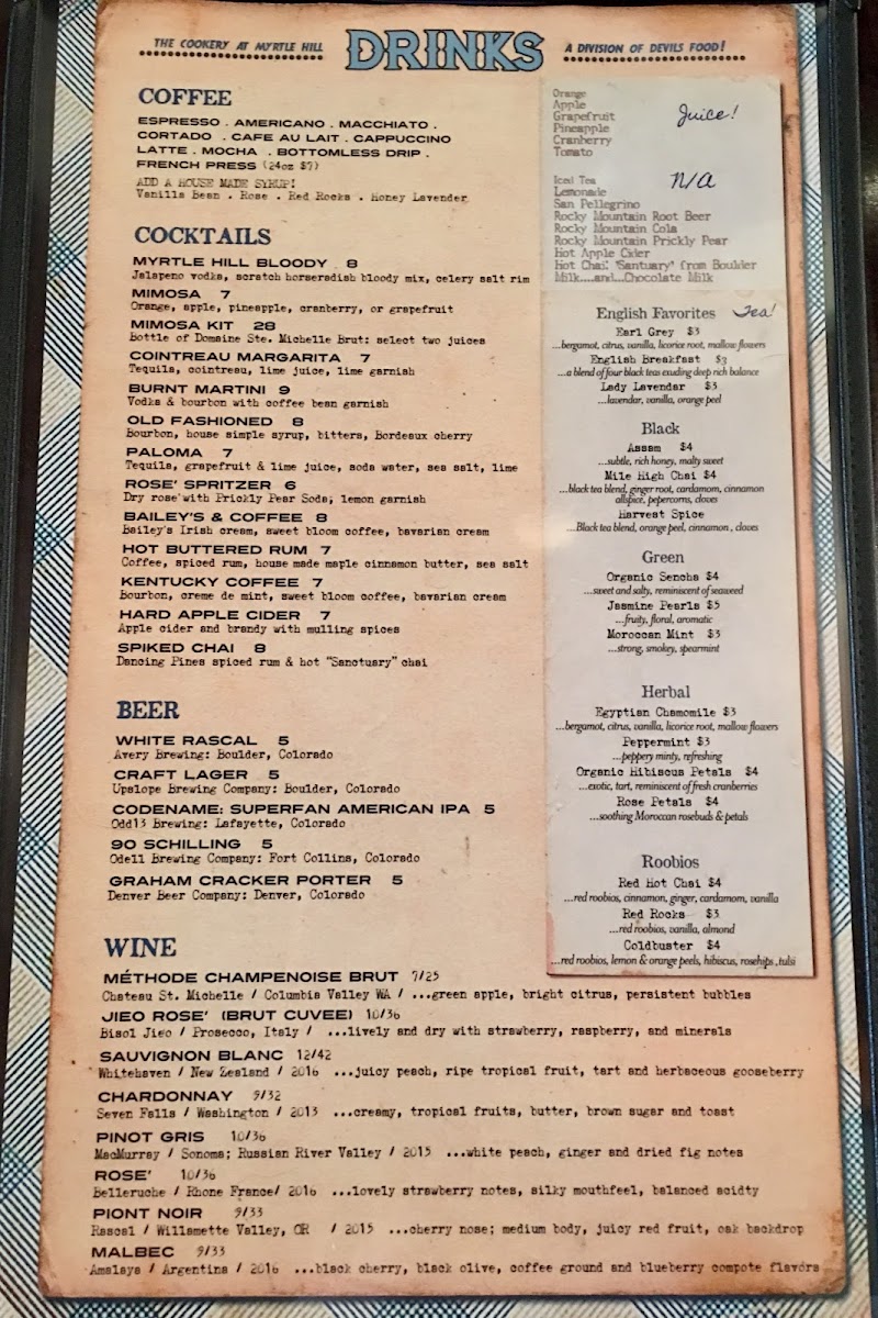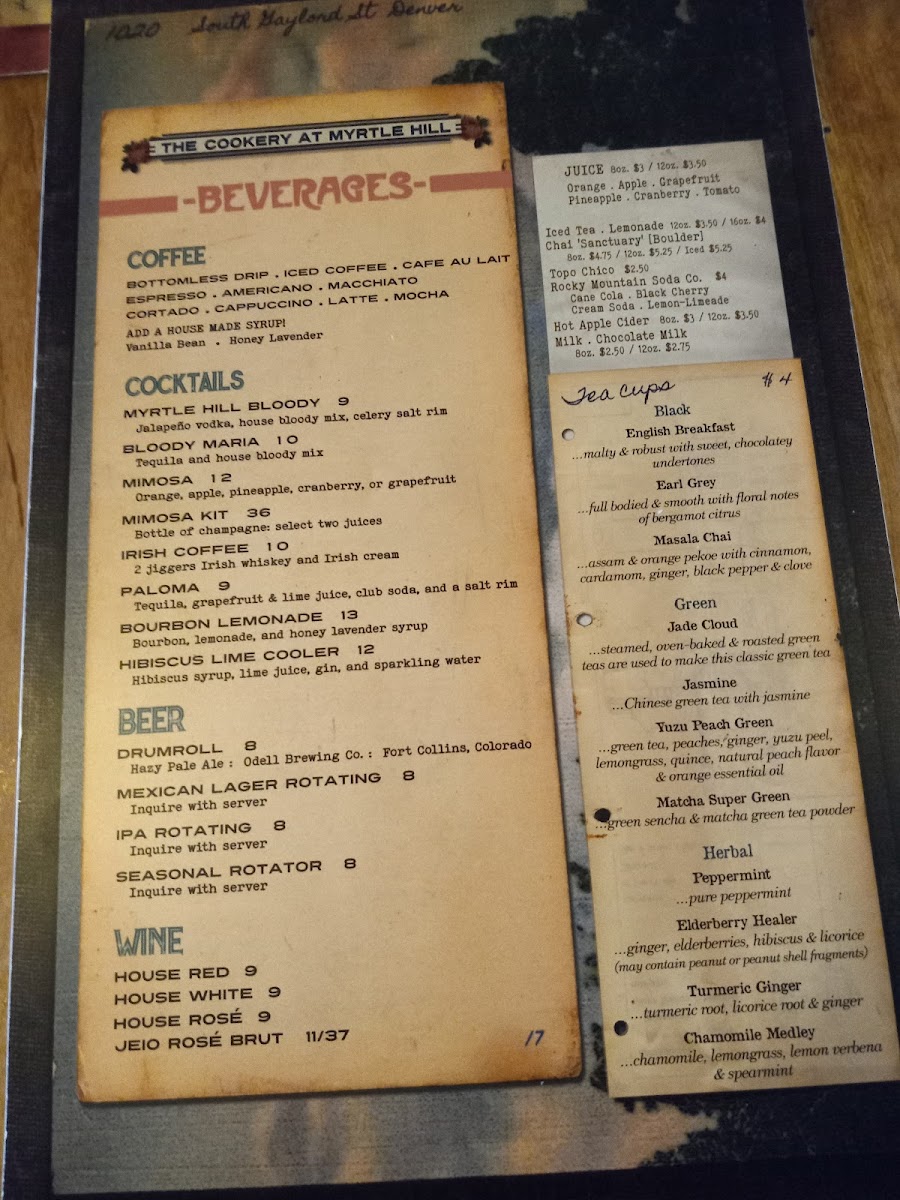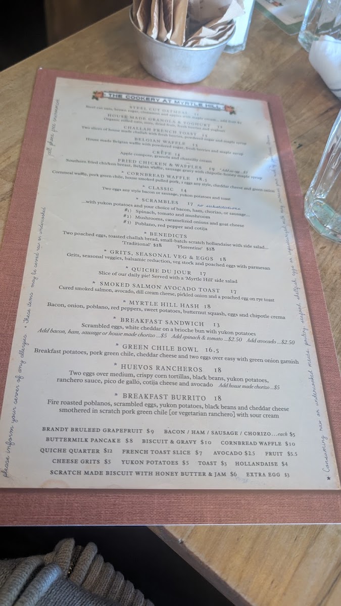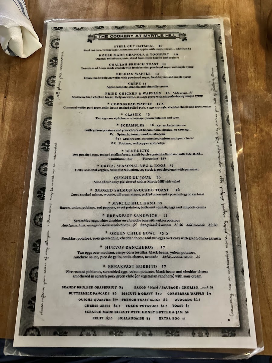 Welcome to The Cookery at Myrtle Hill, a charming dining gem nestled in Denver's vibrant South Gaylord Street. This cozy spot is perfect for those seeking a delightful meal in a relaxed atmosphere, free from the distractions of screens. Guests rave about the unique menu that features standouts like the chicken and Belgian waffles, savory French onion soup, and the unexpectedly delicious cornbread waffle. Each dish reflects a commitment to quality and flavor, with homemade touches like the honey biscuits elevating the experience.